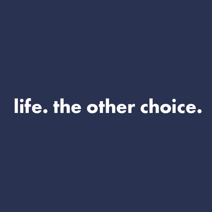 This navy blue t-shirt features the powerful statement “life. the other choice.” on the front. Choose between two impactful design options for the back. Wear it proudly and help promote a message of life—the other choice! Please refer to the size chart before placing your order.